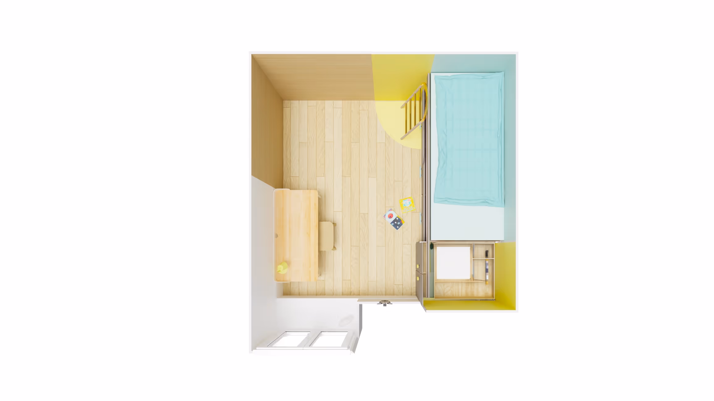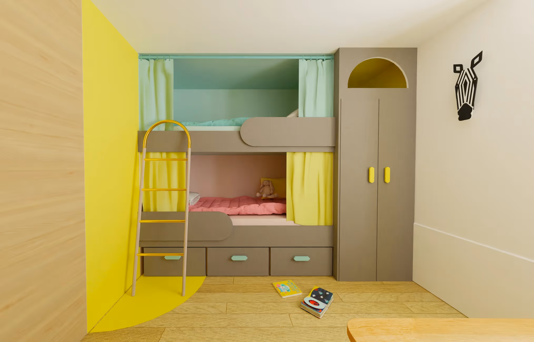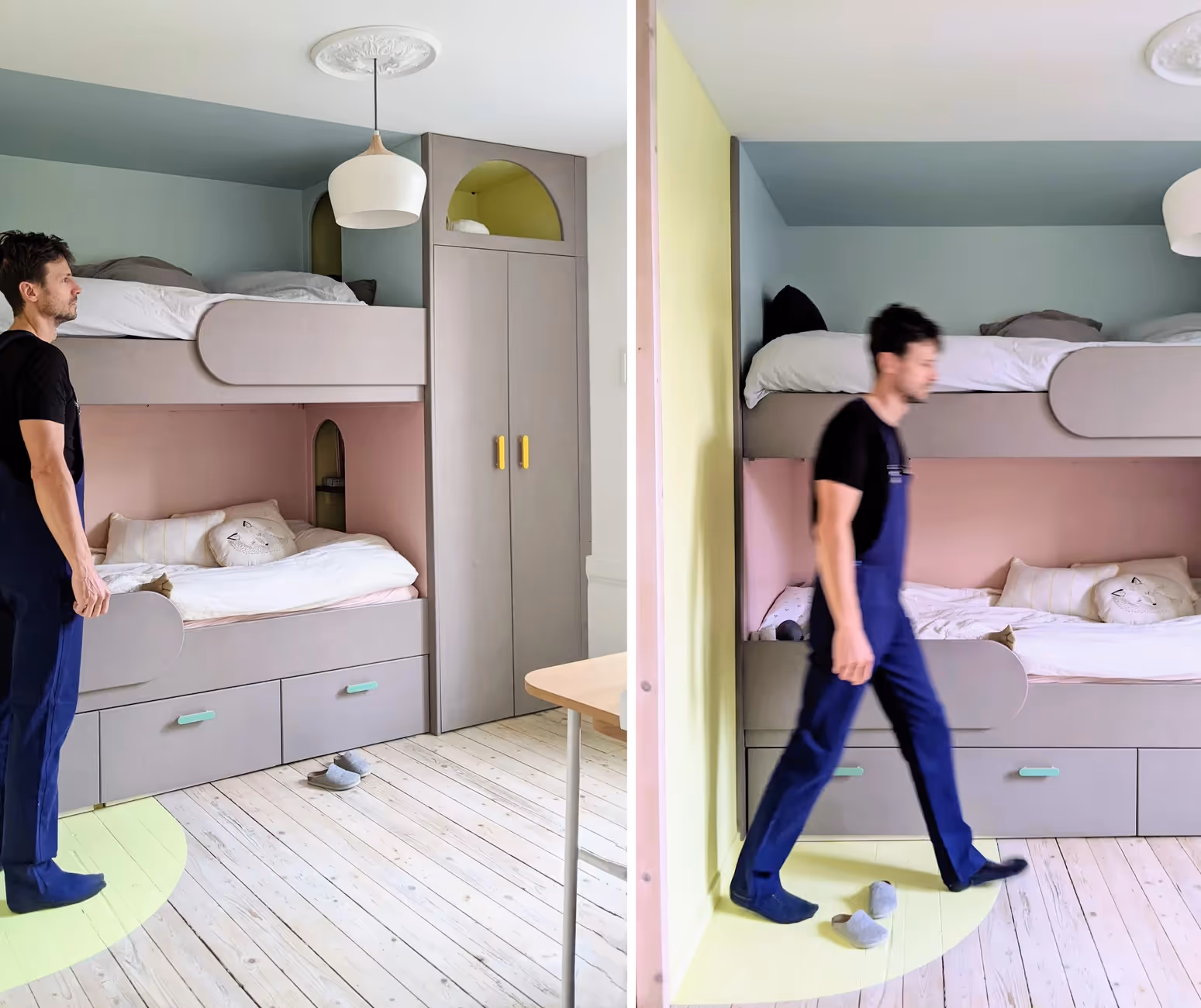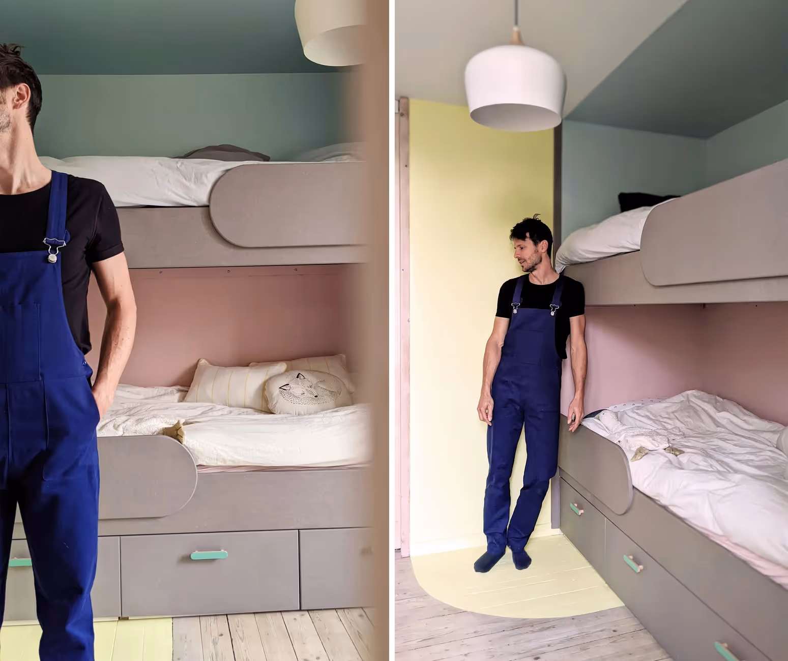 Un mobilier pensé dans le but d'optimiser l'espace dans une chambre de 9 m² et d'apporter de la douceur par le choix des harmonies colorées, des matériaux respectueux (issus du réemploi) et les courbes des nombreuses niches "à secrets" pour ces deux petites personnes ♡♡