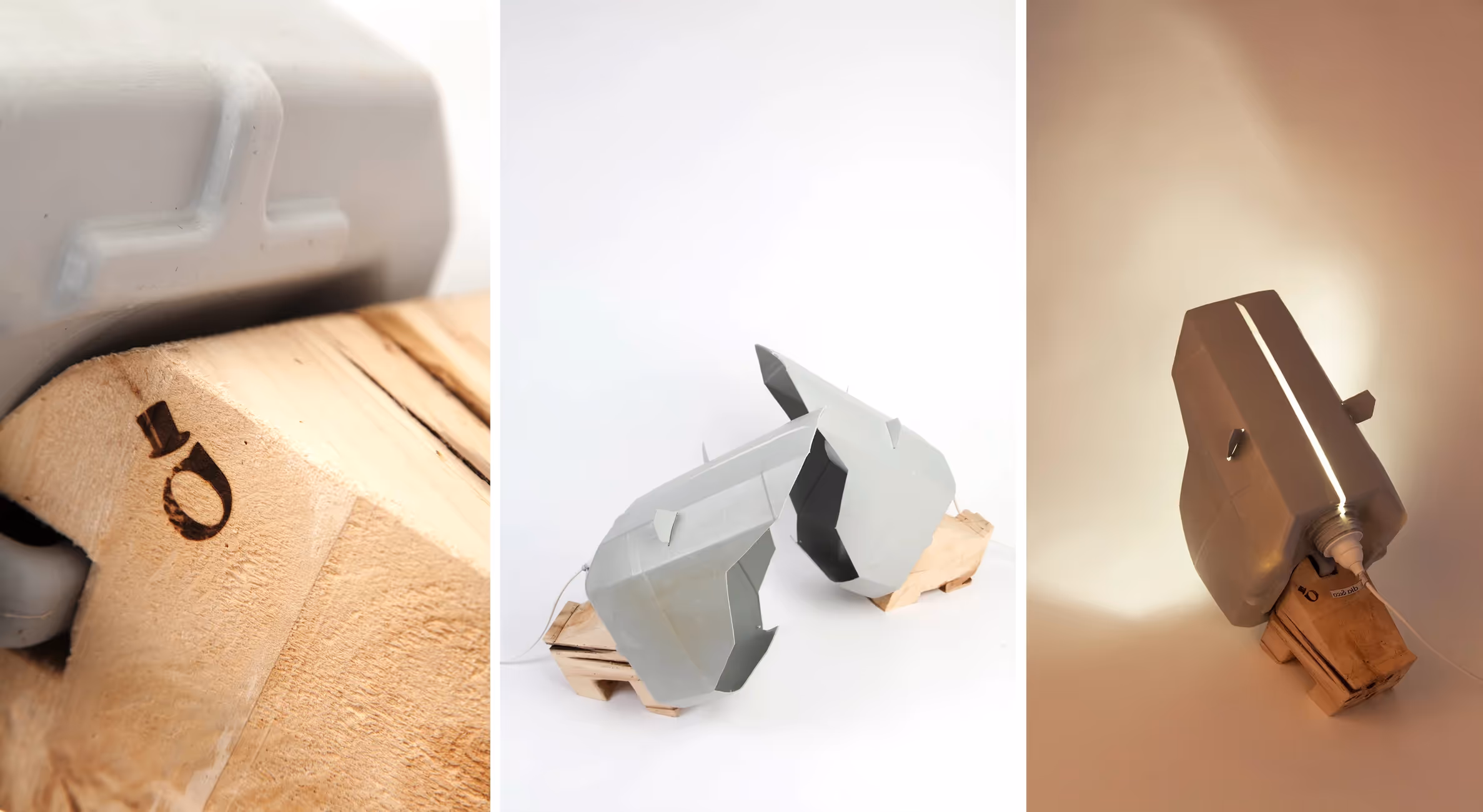 My Bull PET est un animal de garde extrêmement lumineux. Il est principalement conçu à partir d'un bidon de 20 litres surcyclé, utilisé comme emballage avant de devenir abat-jour. Son corps brut est fait d'anciennes poutres en peuplier. Son look brutaliste lui confère des allures de chien de garde. Tous les objets dia &co ont été co-créés & conçus à 4 mains avec Sebastian Dittus, designer produit.