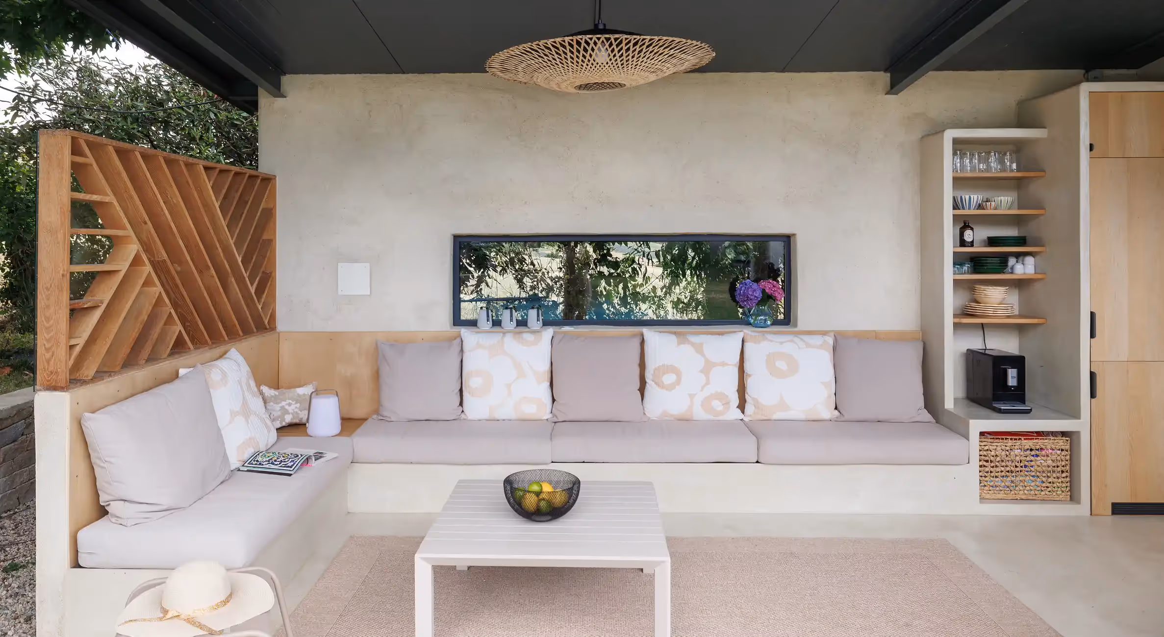 Ce Pool house propose de vivre une parenthèse intérieure en pleine nature. Un mariage entre brut de décoffrage et douceur des lignes. Pour ce projet, j'ai fait le choix de matériaux et couleurs naturelles, et minérales. Ici, l'aspect brut de la chaux appliquée sur les murs contraste avec la douceur du béton ciré lissé sur le plan de travail et bâti de la cuisine intégrée. Un jeu de textures complémentaires unit par une couleur chaleureuse. Le salon médina invite à la détente et au repos.