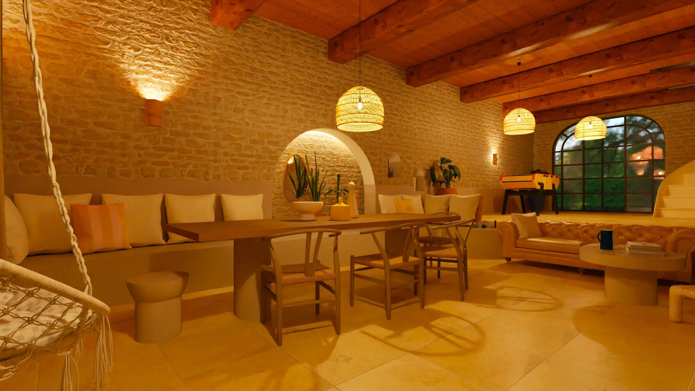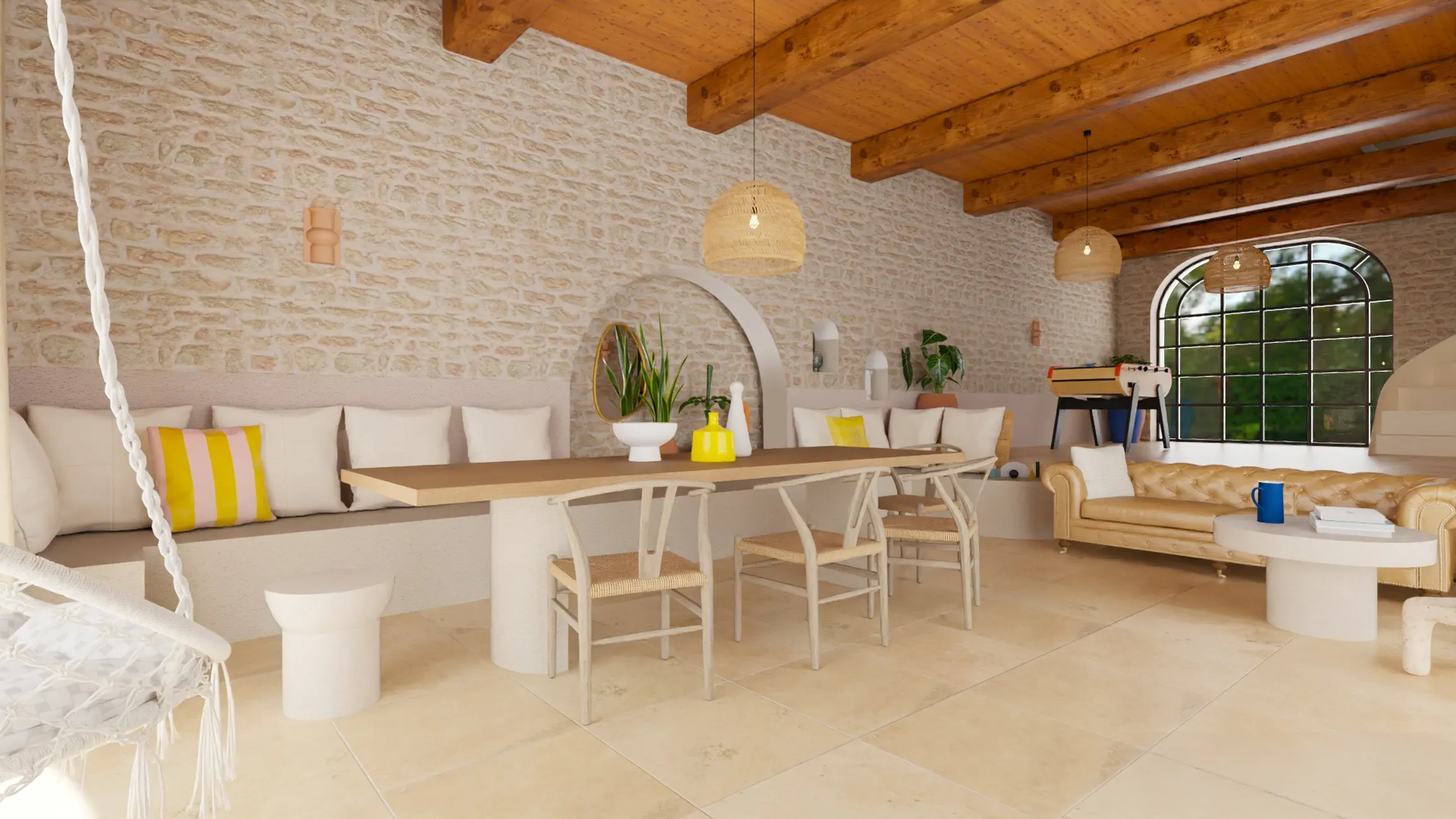 Un espace extérieur de 100 m² aménagé pour héberger des temps de détente et de déjeuner pour cette famille nombreuse, ainsi que pour les hôtes qu'elle accueille dans les dépendances d'une ancienne bâtisse en pierre du 18 ème siècle. Du cachet, de beaux volumes et matériaux à valoriser sur ce projet de rénovation. Le Clos, un espace couvert au sein d'un splendide jardin paysagé.
