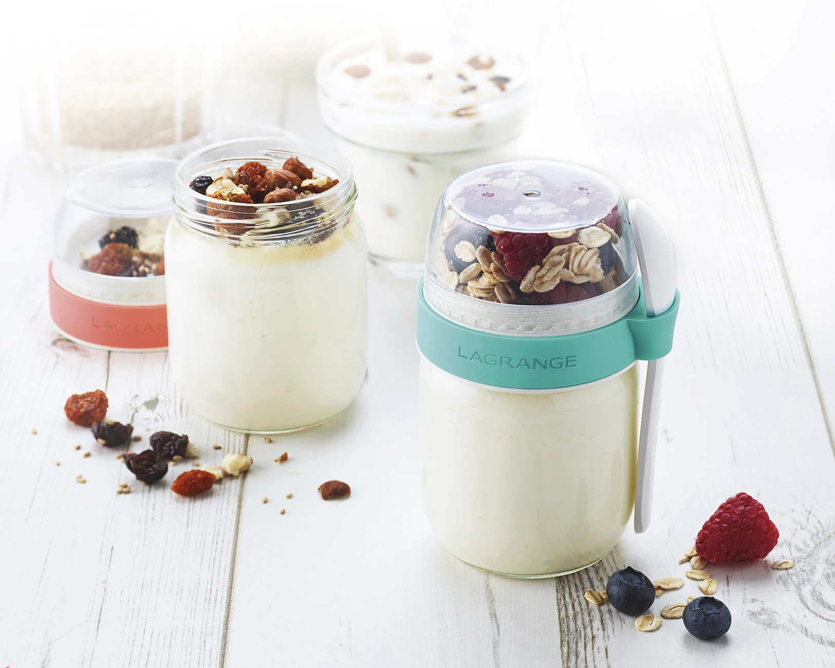 Une collection de pots de yaourt à emporter se voit également harmonisée. Ici la couleur permet de personnaliser les bagues acidulés maintenant les cuillères de ces pots de yaourt nomades.