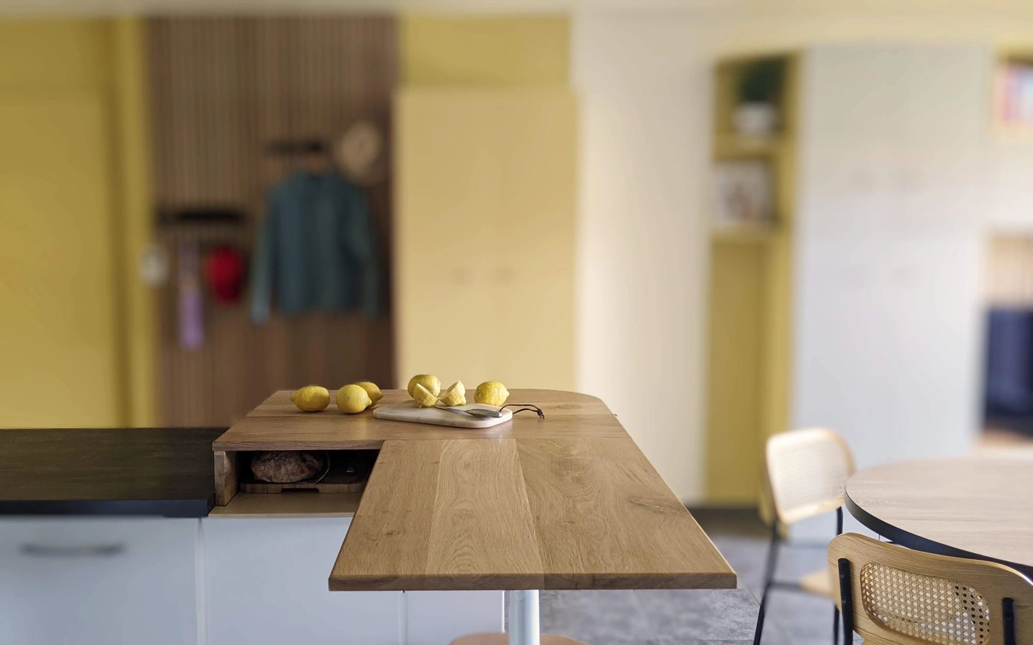 Le Salon Citron est une pièce de vie multi-fonctions. L'enjeu principal de cet aménagement fut l'optimisation des usages dans une même pièce devant combiner plusieurs fonctions : entrée ~ cuisine ~ salon ~ bureau. De l'aménagement de l'espace à sa mise en œuvre pour un réel gain d'espace de rangement et une meilleure cohabitation des usages pour cette famille de quatre personnes (cuisine intégrée et sol existants).